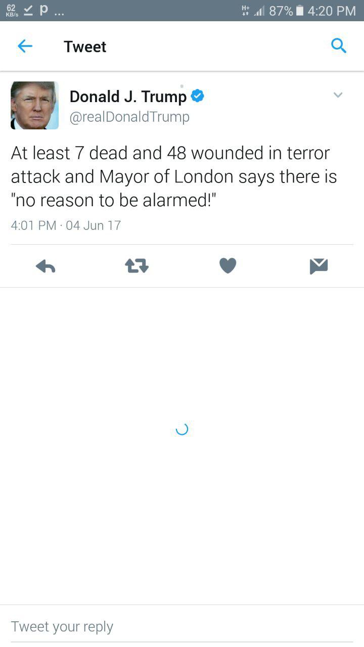 وی در توئیتر خود نوشت: دست کم ۷ کشته و ۴۸ زخمی در حمله تروریستی اخیر داشتیم . آنوقت شهردار لندن می گوید که هیچ دلیلی برای هوشیار بودن نداریم.