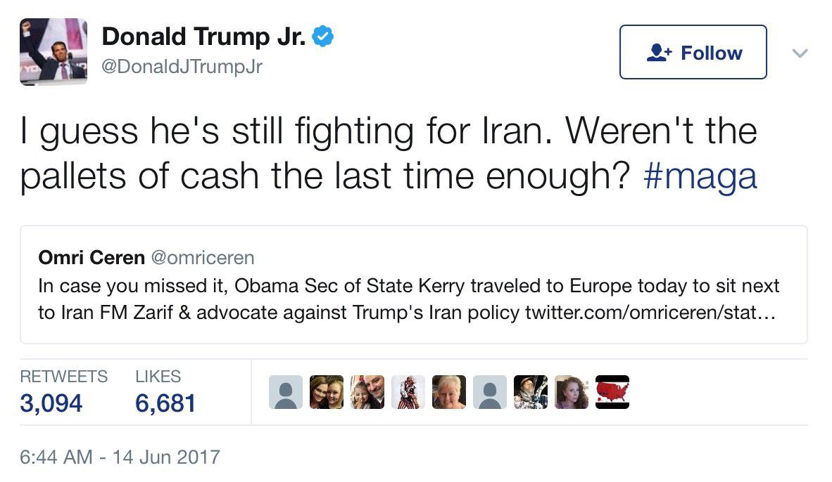 پسر ترامپ با ری توییت کردن پست اومری سرن مشاور ارشد سازمان امریکایی پروژه اسرائیل علیه جان کری، نوشت: تصور میکنم او هنوز برای ایران میجنگد. جعبههای پول دفعه پیش کافی نبود؟