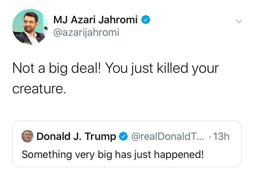 وزیر ارتباطات در پاسخ توییت ترامپ در مورد کشته شدن ابوبکر البغدادی نوشت: هنری نکردی! ساخته دست خودت رو نابود کردی.