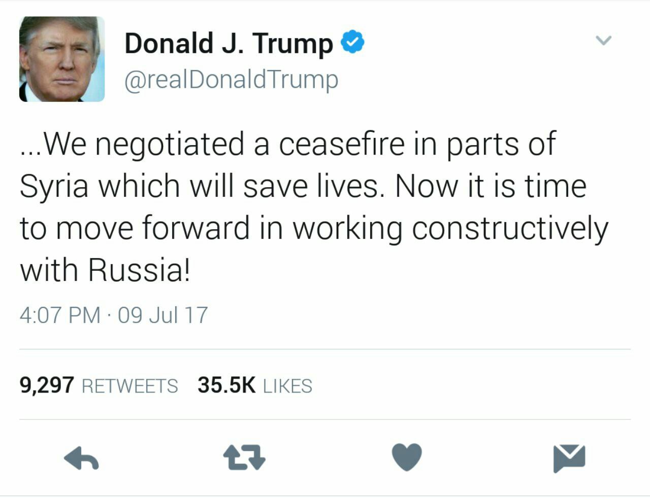 دونالد ترامپ رییسجمهور آمریکا در توئیتی که در پی دیدارش با ولادیمیر پوتین، رییسجمهور روسیه در جریان اجلاس گروه 20 در آلمان منتشر کرد، گفت: زمان آن رسیده که در مسیر همکاری سازنده با روسیه به جلو حرکت کنیم.