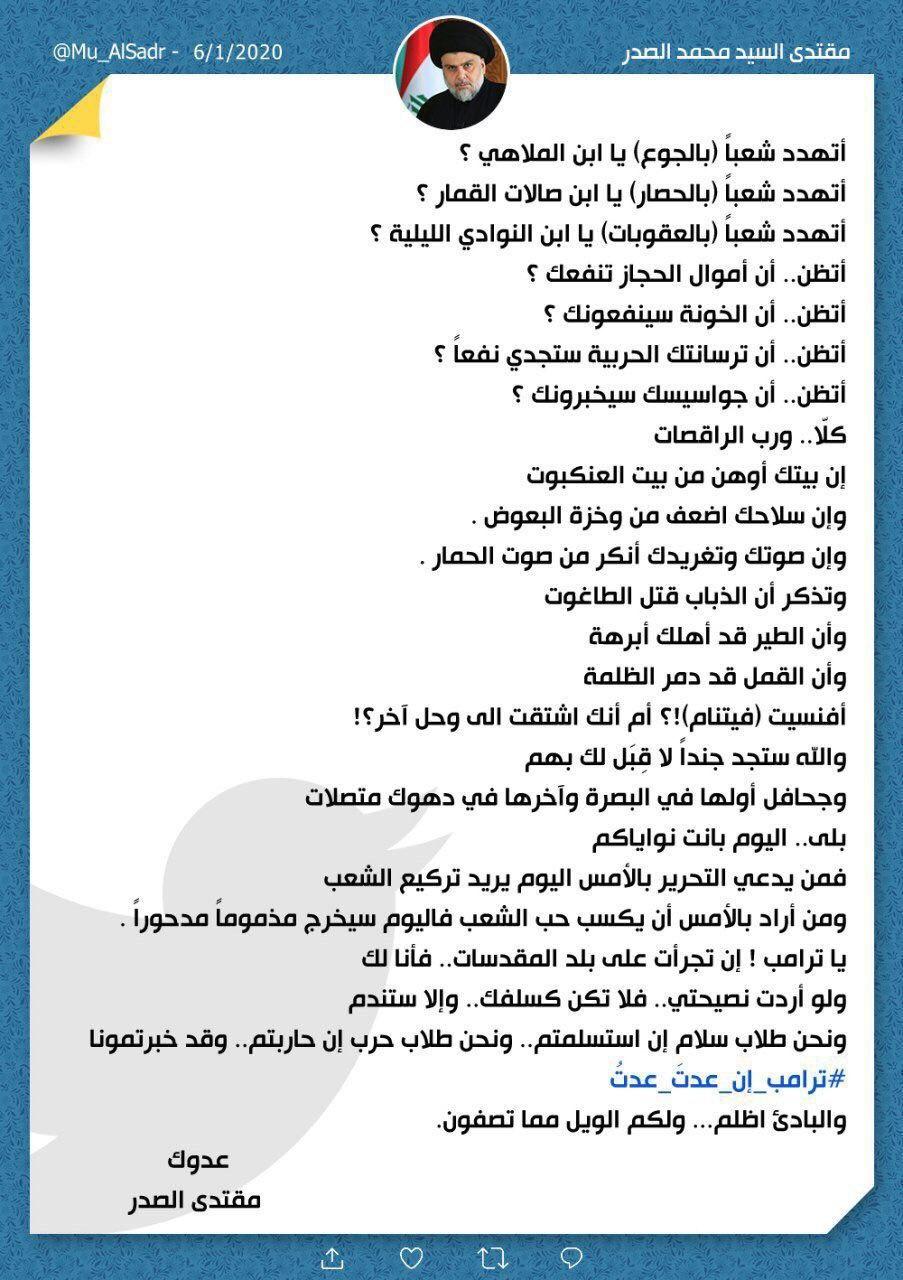 مقتدی صدر با انتشار یادداشتی در توئیتر ترامپ را «کابارهزاده» خواند و در خطاب به رئیسجمهور آمریکا گفت: