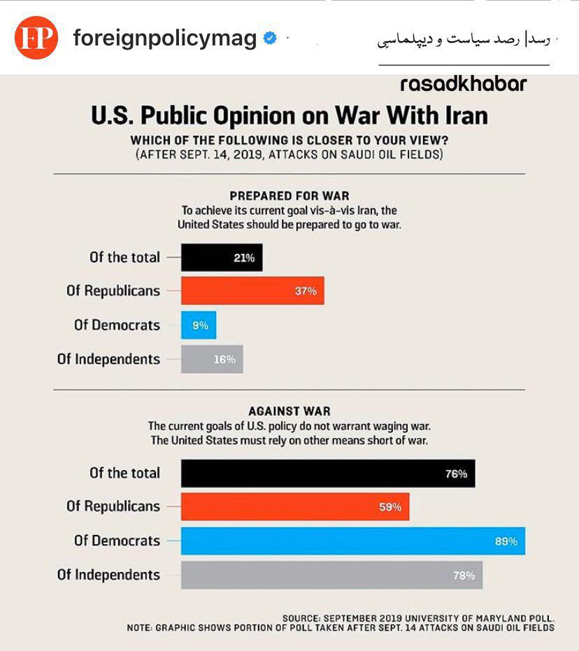 سه چهارم پاسخ دهندگان آمريكايى به يك نظرسنجى ترامپ را بابت تصميماتش (دستور ترور شهيد سليمانى ) نكوهش مى كنند و مخالف جنگ و تنش با ايران هستند.