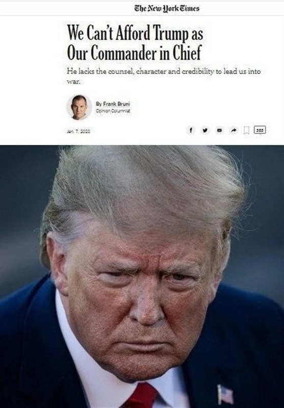 روزنامه آمریکایی نیویورک تایمز در مطلبی با اشاره به بی کفایتی ترامپ و روش غیردپلماتیک وی برای تعامل با کشورها از جمله ایران نوشته است: ما نمیتوانیم به ترامپ به عنوان فرمانده کل قوای خود اعتماد کنیم.