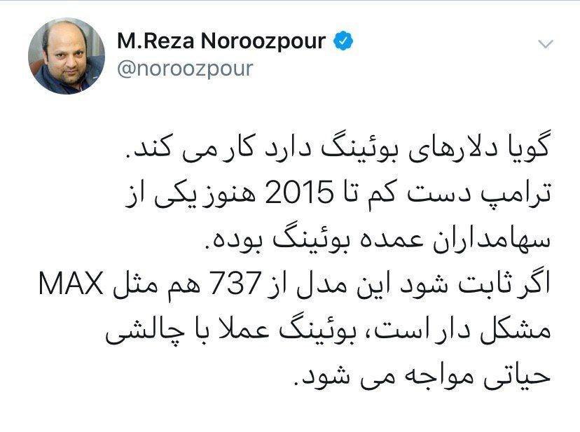 محمدرضا نورورپوز، روزنامه نگار با توییتی یادآوری کرد که ترامپ از سهامداران بوئینگ بوده است.