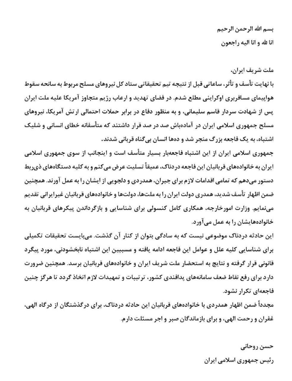 رئیسجمهور در بیانیهای درباره سقوط هواپیمای اوکراینی نوشت: ساعاتی قبل از نتیجه تیم تحقیقاتی ستاد کل نیروهای مسلح آگاه شدم
