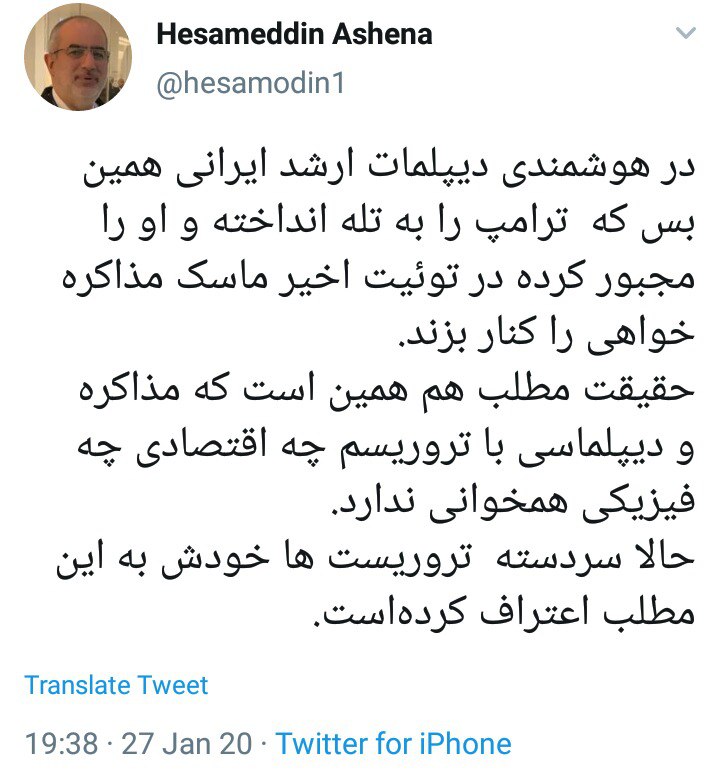 حسامالدین آشنا در توییتی نوشت: در هوشمندی دیپلمات ارشد ایرانی همین بس که ترامپ را به تله انداخته و او را مجبور کرده در توئیت اخیر ماسک مذاکره خواهی را کنار بزند.