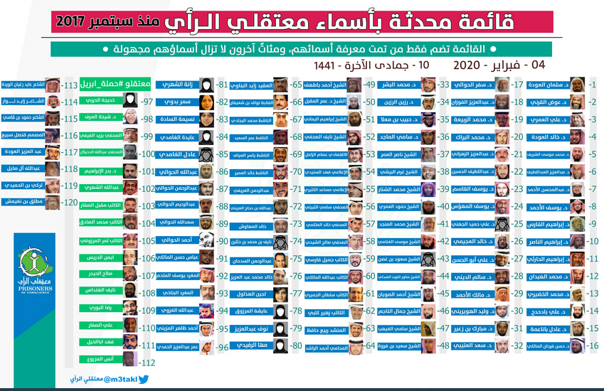 حساب توییتری «معتقلی الرأی» (بازداشت شدگان اندیشه) لیست روحانیون، فعالان، شعرا و پژوهشگرانی که عربستان سعودی از ۲۰۱۷ تا کنون بازداشت کرده، منتشر کرد.