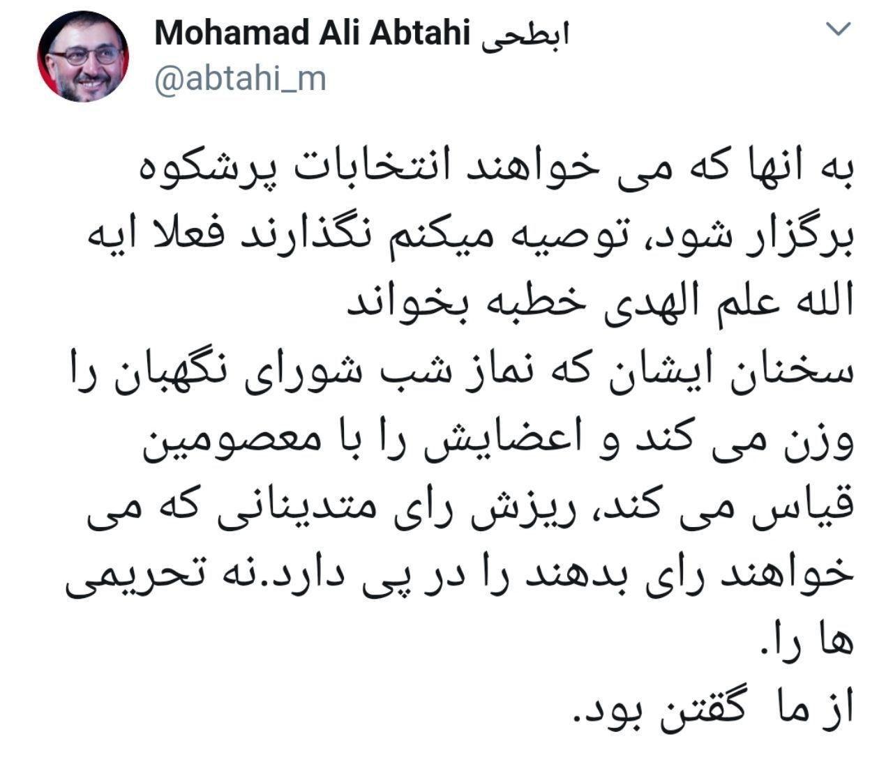 محمدعلی ابطحی در واکنش به سخنان علم الهدی توئیتی منتشر کرد.