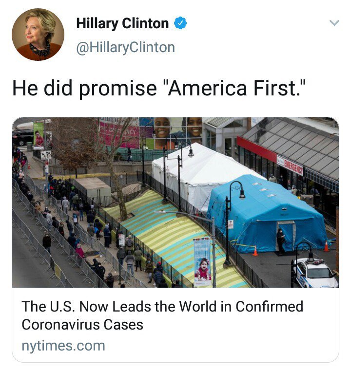هیلاری کلینتون با اشاره به گزارش نیویورک تایمز درباره صدرنشینی آمریکا در فهرست کشورهای بیشترین مبتلا به کرونا به شعار انتخاباتی ترامپ طعنه زده و نوشته: او قول داده بود «امریکا اول باشد»!