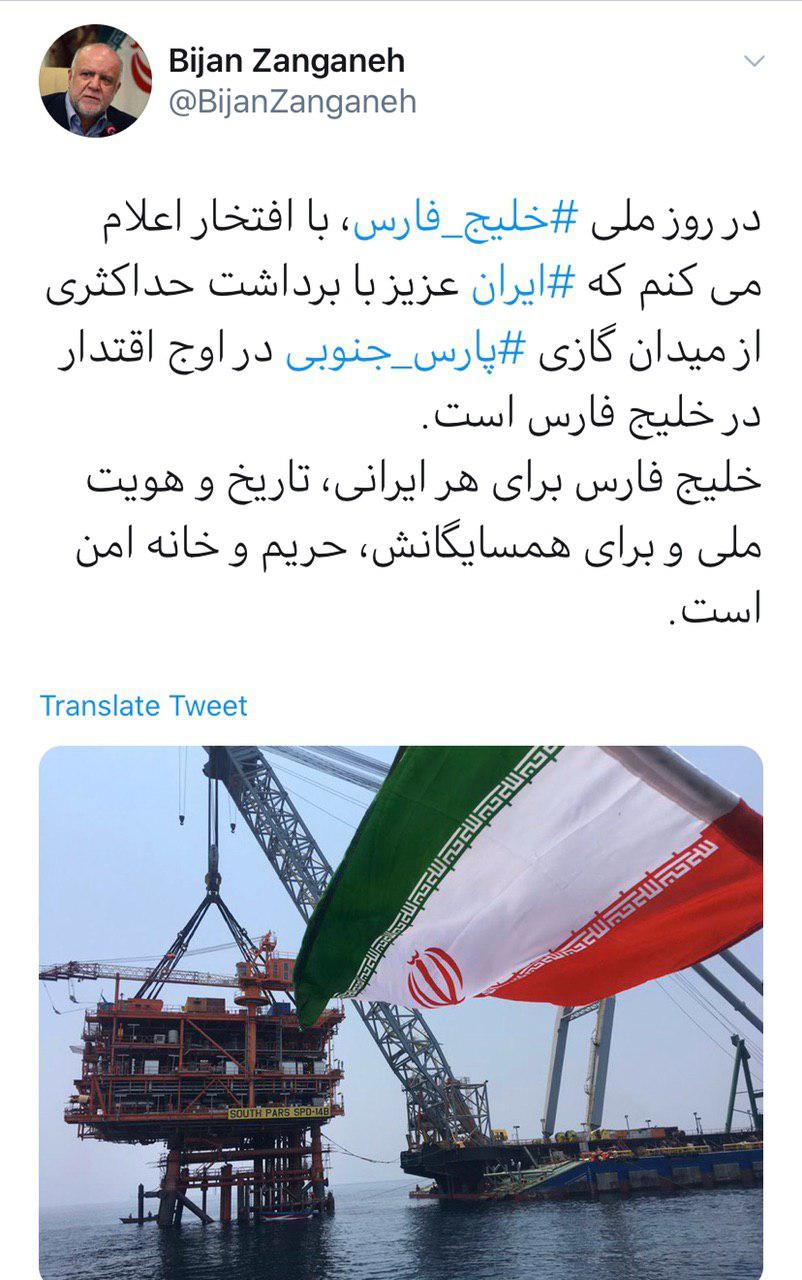 وزیر نفت به مناسبت روز ملی خلیج فارس توییت کرد: ایران با برداشت حداکثری از میدان گازی پارس جنوبی در اوج اقتدار در خلیج فارس است.
