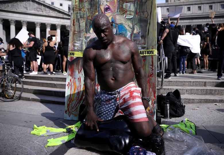 تظاهرات "نمیتوانم نَفَس بکشم" و بازسازی صحنه قتل "جورج فلوید" از سوی یک معترض رنگین پوست در تظاهرات (دیروز) در شهر نیویورک آمریکا