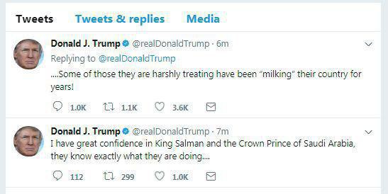 ترامپ در توئیتری نوشت: اعتماد زیادی به ملک سلمان و ولیعهد عربستان سعودی دارم. آنها می دانند دقیقا چه کاری می کنند.