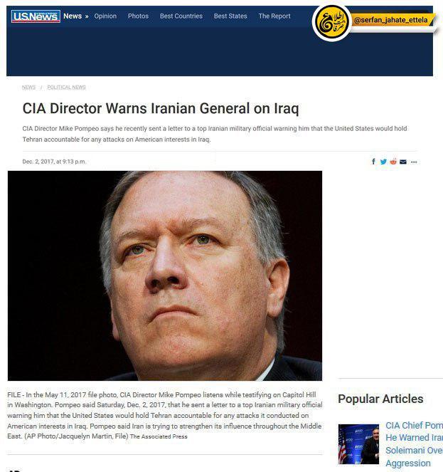 «مایک پمپئو» در سخنانی خبر داد نامه‌ای به سردار سلیمانی نوشته بوده اما با بی توحهی وی رو به رو شده است.