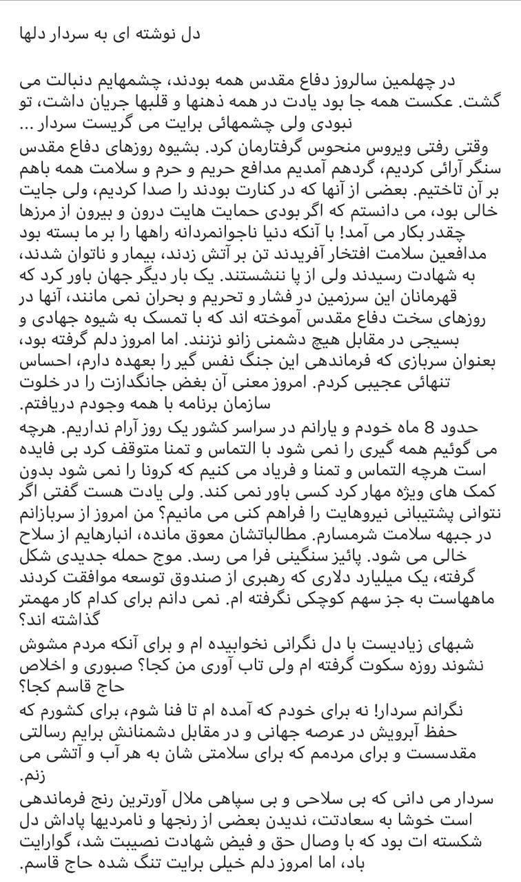 حاج قاسم فرشته الهی بودکه نازل شدبرای چهل سال مدافع بی ادعا عزیزشهیدکربلاروحت شادچرابعدازشهادتش کسی دلسوزوصادق پیدانشدگرانی ومصیبت وافزایش یافت شیرمردخدا