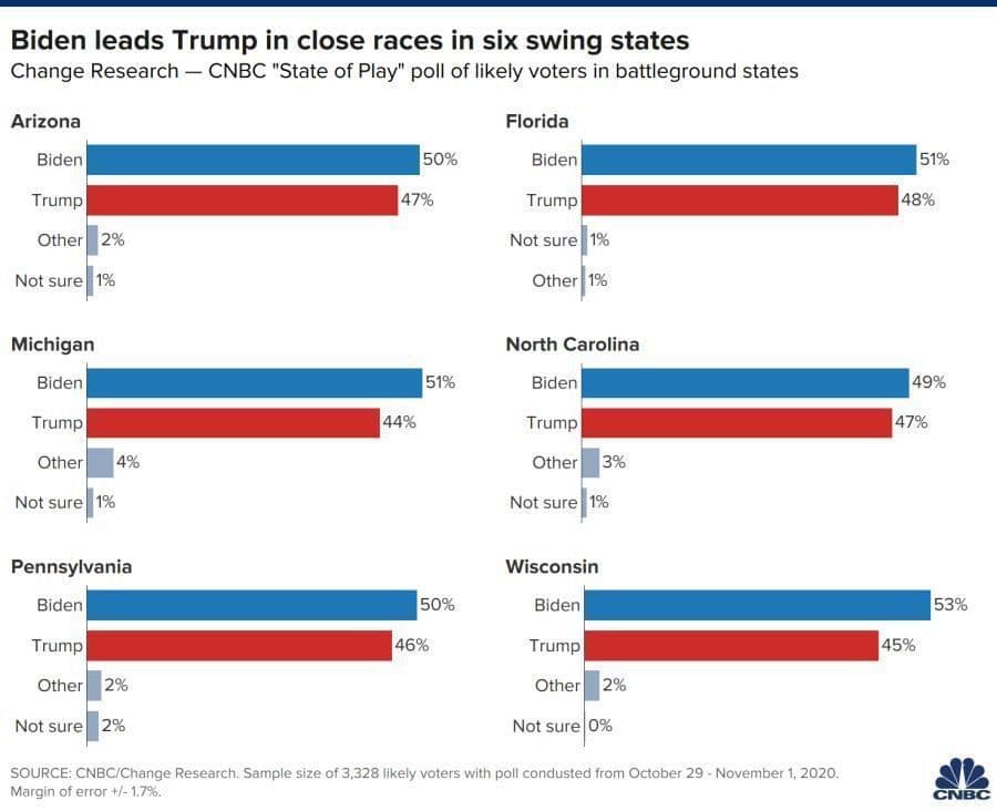 به گزارش سیانبیسی جو بایدن در شش ایالت تعیینکننده که ترامپ هدف قرار داده بود با اختلاف اندکی نسبت به ترامپ اکثریت آرا را در اختیار دارد.