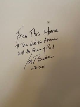 جو بایدن نامزد دموکرات ها امروز سری به خانه کودکیاش در شهر صنعتی سکرانتون زد تا پیامی روی یکی از دیوارهای خانه بنویسد به این امید که برایش خوش شانسی بیاورد. «از این خانه، به کاخ سفید، به لطف خدا».