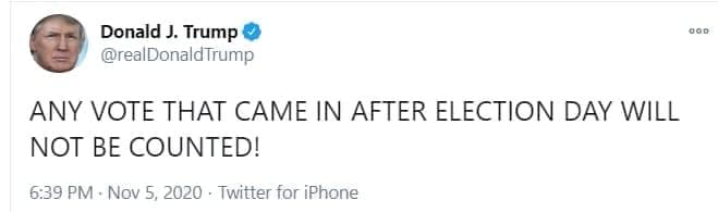 رئیس جمهور آمریکا نوشت که هر رایی پس از روز انتخابات آمده باشد مورد شمارش قرار نمیگیرد.