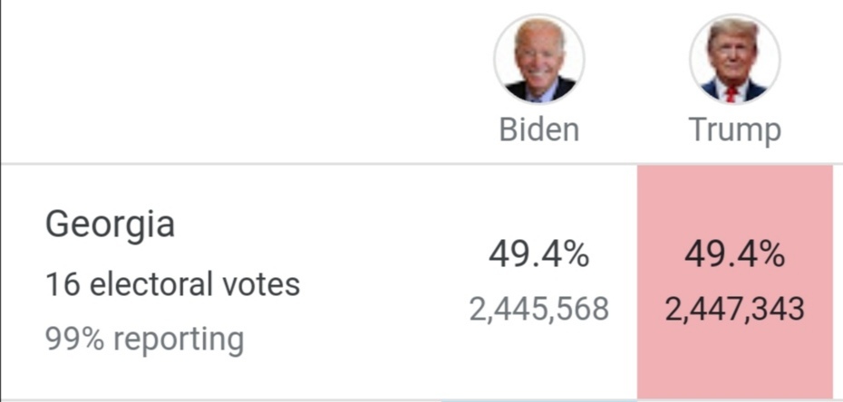 اختلاف آرای «جو بایدن» و «دونالد ترامپ» کاندیداهای انتخابات ریاستجمهوری آمریکا در ایالت حساس جورجیا به هزار و ۷۷۵ رای رسید.