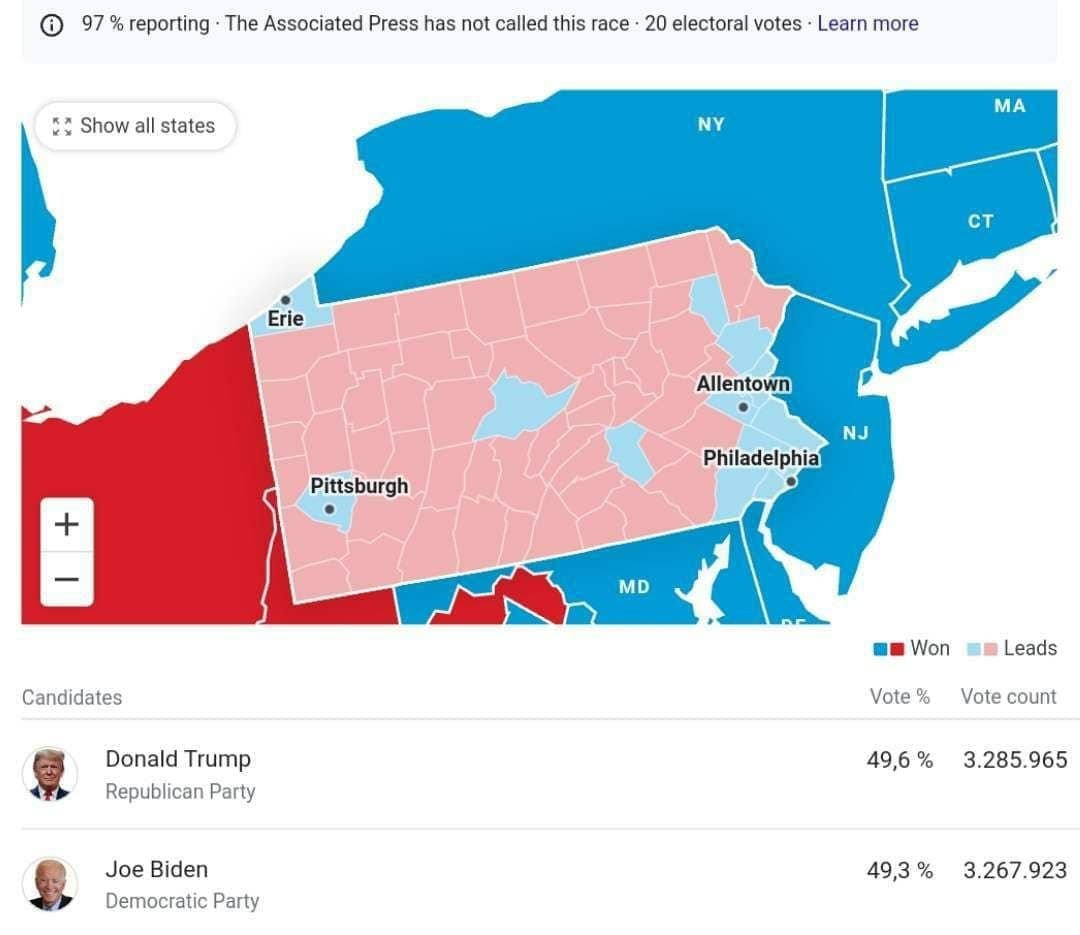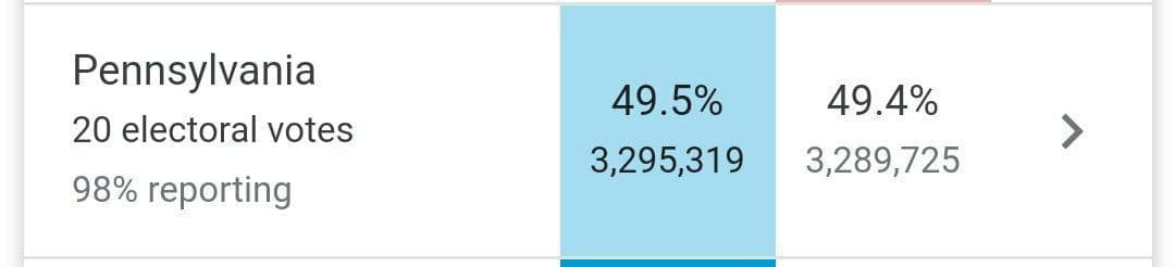 بعد از جورجیا اختلاف ترامپ و بایدن در پنسیلوانیا نیز در حال کمتر شدن است. دقایقی قبل ایالت پنسیلوانیا نیز آبی شد.