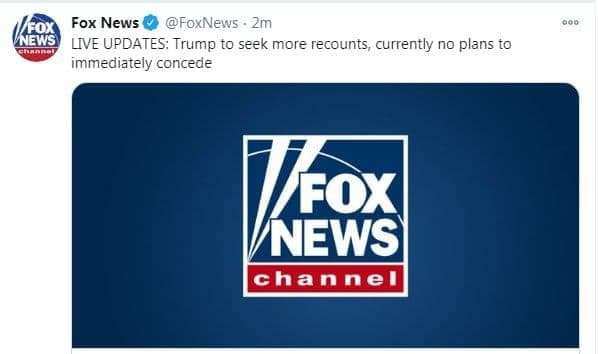 فاکس نیوز تایید کرد که ترامپ درصدد بازشماری بیشتر آراء است و فعلا برنامه ای برای پذیرش شکست انتخاباتی و واگذاری سریع قدرت ندارد.