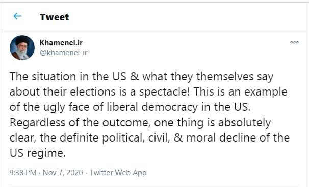 واکنش توئیتر رهبر معظم انقلاب به خبر پیروزی جو بایدن