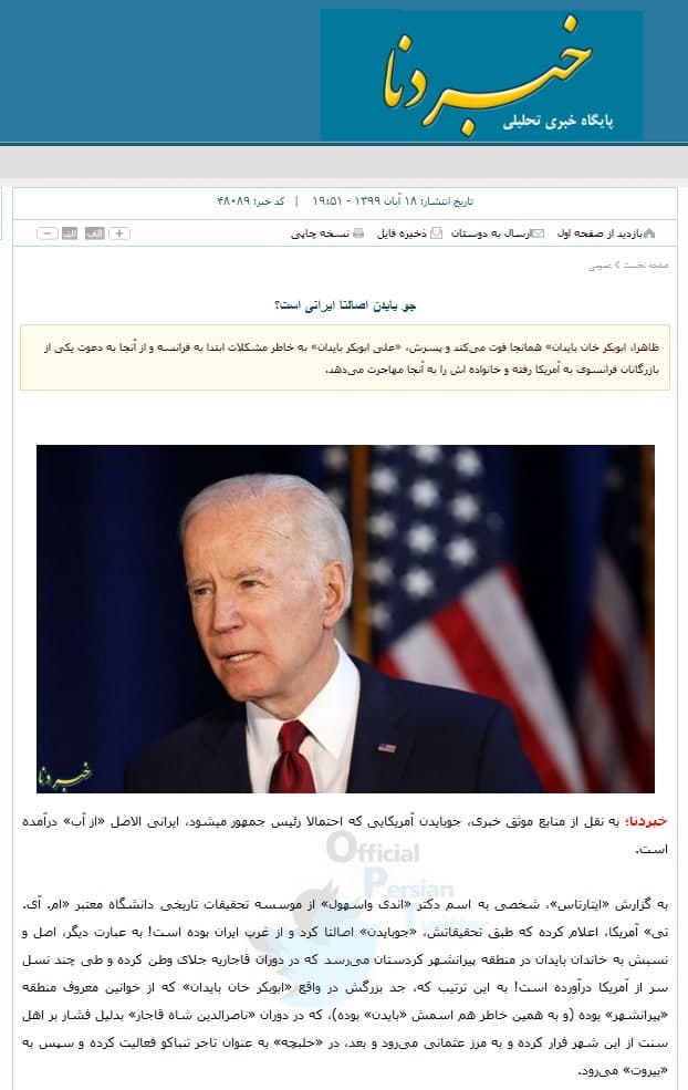 "به نقل از منابع موثق خبری، جوبایدن آمریکایی که احتمالا رئیس جمهور میشود، ایرانی الاصل «از آب» درآمده است.