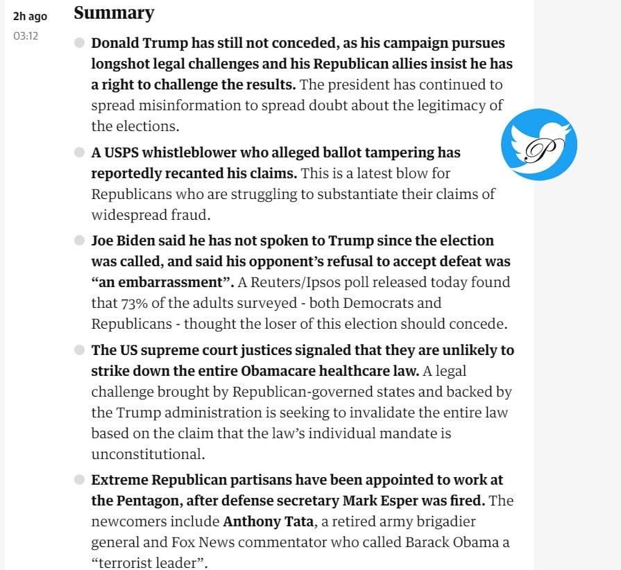 ترامپ هنوز شکست را قبول نکرده و در حال به چالش کشاندن شمارش آرا است. رئیس جمهور همچنان به انتشار اخبار غلط با هدف ایجاد تردید در قانونی بودن انتخابات ادامه میدهد.