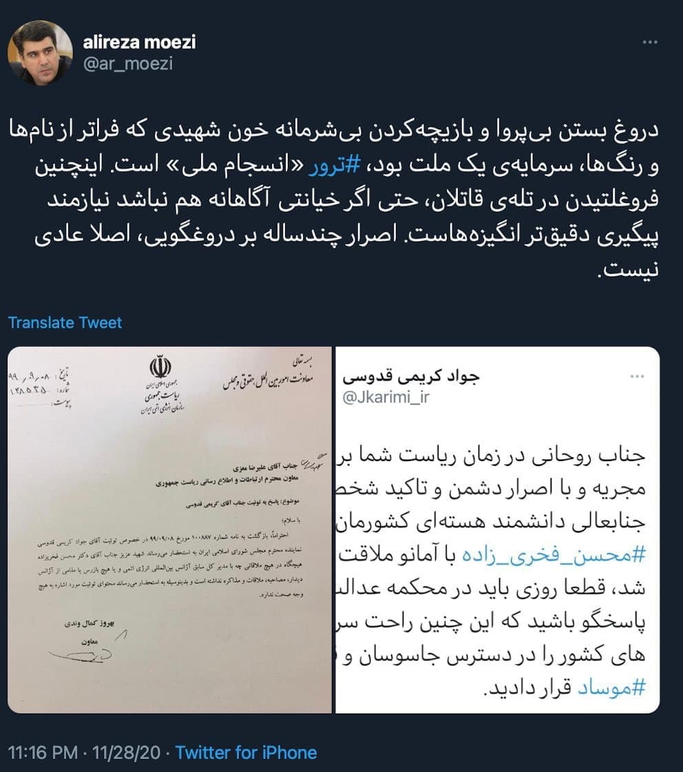 علیرضا معزی، معاون ارتباطات و اطلاعرسانی دفتر رئیس جمهور با انتشار تکذیبیه سخنگوی سازمان انرژی اتمی در توییتی نوشته است: «دروغ بستن بیپروا و بازیچهکردن بیشرمانه خون شهیدی که فراتر از نامها و رنگها، سرمایهی یک ملت بود، ترور «انسجام ملی» است. اینچنین فروغلتیدن در تلهی قاتلان، حتی اگر خیانتی آگاهانه هم نباشد نیازمند پیگیری دقیقتر انگیزههاست. اصرار چندساله بر دروغگویی، اصلا عادی نیست.»