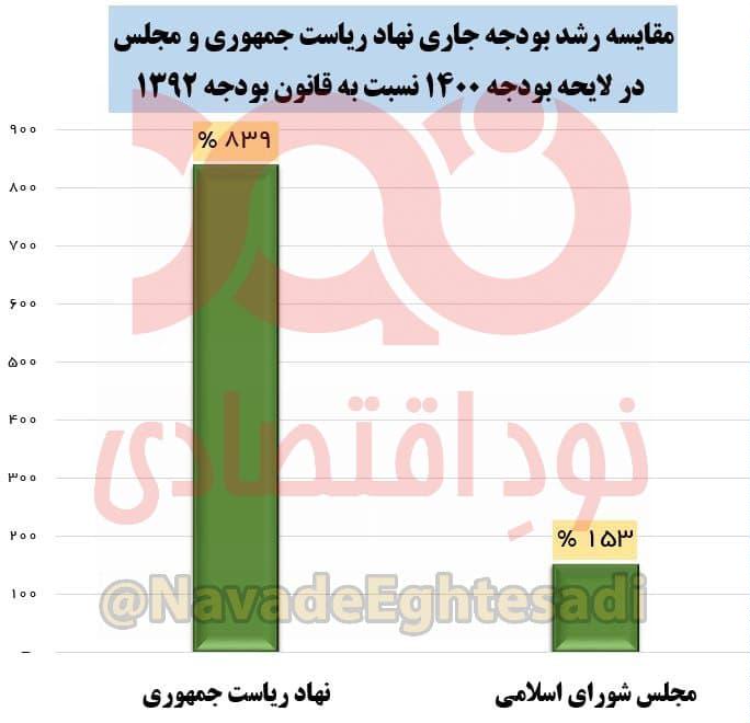 رشد ۸۳۹ درصدی بودجه جاری نهاد ریاست جمهوری در دوره حسن روحانی در حالی است که بودجه مجلس در این مدت فقط ۱۵۳ درصد رشد کرده است.