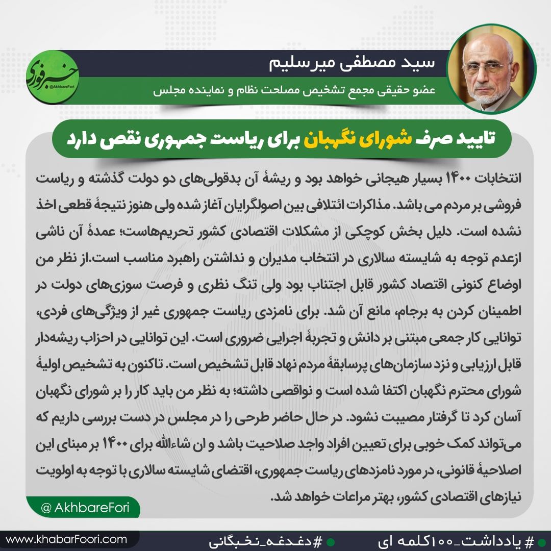 اقای میرسلیم چرا دیگه بعد از افشاگری در خصوص قالیباف و تهدید به شکایت قالیباف برعلیه شما ترسیدی و دهانتان یهویی بسته شده .چرا سریع جا زدی .چرا تا اخر خط نرفتید. واقعا انتظار داشتید رییس جمهور بشید.شما که سند داشتید .پشت پرده سکوت شما را نمیدونم ولی ازاده و شهامت داشته باش.شما یک تحصیلکرده واقعی هستید دوربریهای شما معلومه مدرک دکتراشونو از کجاها و چطوری گرفتن .تمام بدبختی های ما بخاطر بی کفایتی امثال شماهاست .