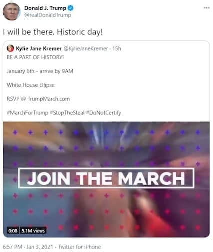 دونالد ترامپ با بازنشر پیامی توئیتری که در آن از طرفداران او دعوت شده بود در اعتراض به نتایج انتخابات ریاستجمهوری در روز ششم ژانویه به خیابانها بیایند، نوشت: «آنجا خواهم بودم. روزی تاریخی!»