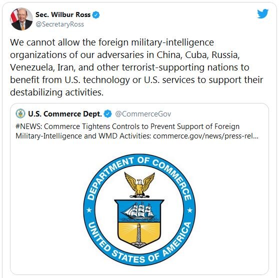 ویلبار روس، وزیر بازرگانی ایالات متحده درباره تشدید کنترلها گفت: «ما نمیتوانیم به سازمانهای اطلاعاتی نظامی دشمنانمان در چین، کوبا، روسیه، ونزوئلا، ایران و دیگر کشورهای حامی تروریسم اجازه دهیم تا از فنآوری یا خدمات ایالات متحده برای حمایت از اقدامات خرابکارانهیشان استفاده کنند.»