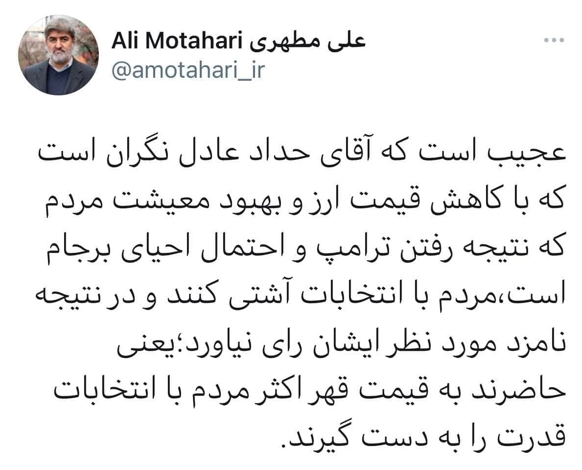 علی مطهری در توئیتی در واکنش با اظهارات اخیر حدادعادل نوشت: «عجیب است که آقای حداد عادل نگران است که با کاهش قیمت ارز و بهبود معیشت مردم که نتیجه رفتن ترامپ و احتمال احیای برجام است، مردم با انتخابات آشتی کنند و در نتیجه نامزد مورد نظر ایشان رای نیاورد؛ یعنی حاضرند به قیمت قهر اکثر مردم با انتخابات قدرت را به دست گیرند.»