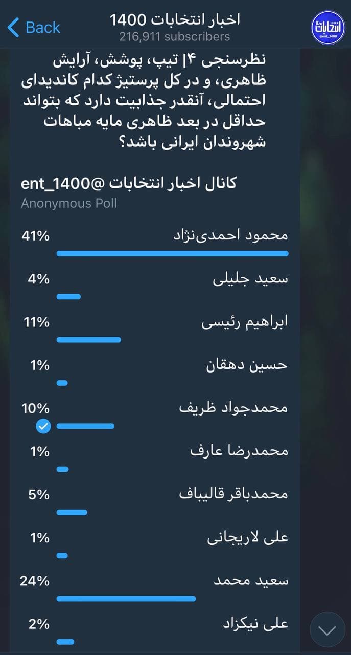 کانال اخبار انتخابات در یک نظرسنجی درباره جذابیت ظاهری نامزدهای احتمالی انتخابات ریاست جمهوری 1400، نتایج جالبی را منتشر کرد.