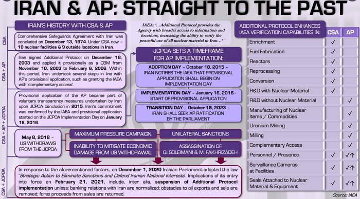 در ادامه آمده است: ۸ می ۲۰۱۸ آمریکا از برجام خارج شد و مجلس شورای اسلامی ایران هم یکم دسامبر ۲۰۱۸ در واکنش به سیاست فشار حداکثری کاخ سفید، تحریمهای یکجانبه، عدم جبران خسارتهای مالی ناشی از خروج آمریکا از برجام و ترور قاسم سلیمانی و محسن فخریزاده قانون اقدام راهبردی برای لغو تحریمها را تصویب کرد. این قانون که شامل توقف اجرای پروتکل الحاقی است از ۲۱ فوریه به اجرا در میآید مگر آنکه روابط بانکی با ایران عادیسازی شود؛ موانع برای صادرات و فروش نفت برداشته شود و درامدهای حاصل از فروش نفت به ایران برگردانده شود.