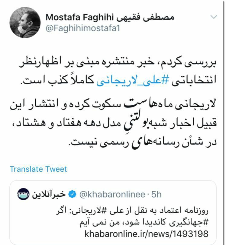 مصطفی فقیهی در توییتی نوشت: خبر منتشره مبنی بر اظهارنظر انتخاباتی علی لاریجانی کاملاً کذب است.