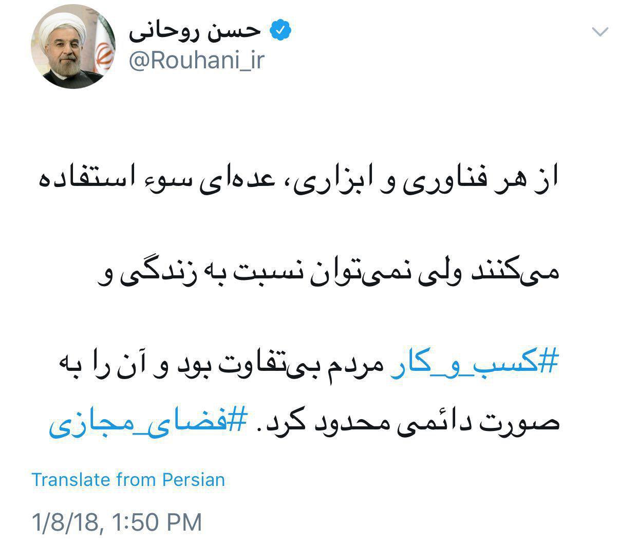 اقای شیخ روحانی میفرمایند جواب اغتشاشگران را مردم میدهند بله این کار را خود مردم کردن ولی جواب مردم را کی میده کی جواب ناتوانی و دروغگویی دولت به مردم را میدهد همه چیز فیلترینگ نیست مردم بیکار بی پول و نا امید-- تلگرام دردشون را دوا نمیکنه البته اینهمه اسیب و کشته مردمی برای دولت درس عبرت نمیشه باز هم مردم فراموش شدن البته دشمنان با تلگرام امیدوار میشوند همانجور که کدخدا ترامپ گفته اقای شیخ حسن روحانی شما خیلی نسبت به شبکه های اجتماعی احساس مسئولیت میکنید ولی چرا بعد از گذشت 5 سال از مسئولیت شما شبکه اجتماعی ساخته نشده تا خواسته مردم براورده شود و مورد اقبال قرار گیرد تا مردم هزینه سنگین این فتنه را نپردازند ایا دولت ووزارت ارتباطات شما توانایی همین یک کار را هم نداشت حالا این خاطرات تلخ برای ایران تمام نشده فرافکنی میکنید دم از رفع فیلترینگ میزنید اما نمیگویید که این شبکه ها در این ایام چه بر سر ایران اوردند که ملیونها نفر از مردم ایران دلشکسته و عصبانی در راهپیما ئیها شرکت کردند باز هم صدای این ملت را نمی شنوید از فریاد ملت بترسید من بعنوان یک ایرانی بشما میگویم که این سه سال هم میگذرد با شعار چند بار فیلترینگ و پسابرجام و پرخاش به مردم ونهادها و نمیگذارم به حساب بانکی ملیاردرهای سرک بکشید-- پس میخواهید مالیات را از صندوق مغازها و فقرای جامعه با گرانی بگیرید چقدر دزدان و جاسوسان وفتنه گران به بهانه جذب سرمایه در امانند