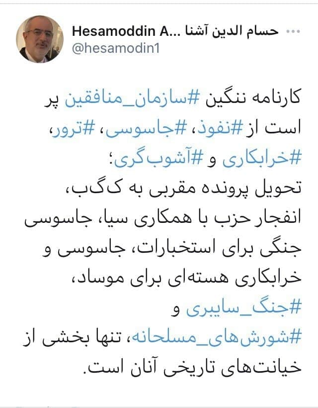 رییس مرکز بررسیهای استراتژیک ریاستجمهوری در توئیتی نوشت: کارنامه ننگین سازمان منافقین پر است از نفوذ، جاسوسی، ترور، خرابکاری و آشوبگری.