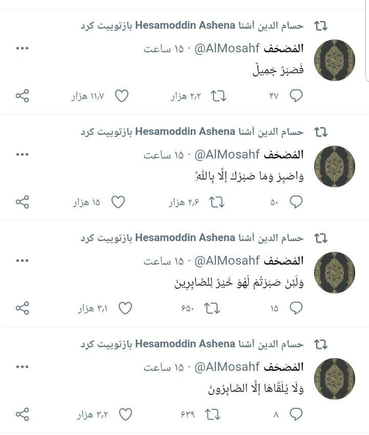 حسام الدین آشنا مشاور رئیس جمهور و رئیس پروژه تجربه نگاری دولت، از زمان انتشار صوت مصاحبه ظریف و اتهاماتی که به مرکز تحت نظر او وارد شده مدام آیات قرآن با مفهوم صبر را بازتوییت میکند.