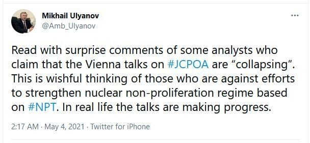میخائیل اولیانوف در صفحه توئیتر خود نوشت: «با تعجب، نظرات برخی تحلیلگران را میخوانم که ادعا میکنند گفتوگوهای وین درباره برجام، در حال فروپاشی است».