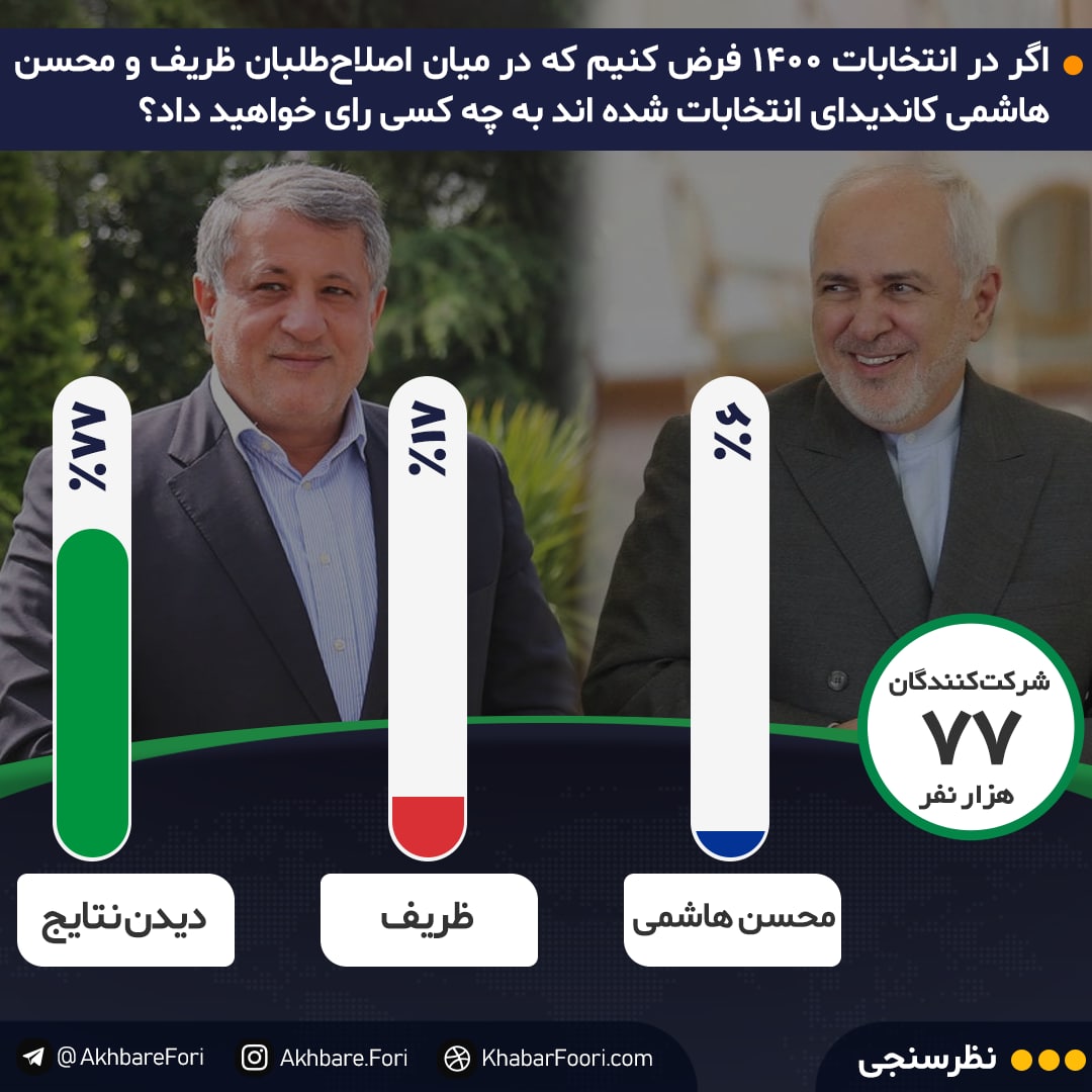 در نظرسنجی خبر فوری که با فرض نامزدی ظریف و هاشمی در انتخابات ۱۴۰۰ طراحی شده، ۷۷درصد از مخاطبان شرکت کننده در نظرسنجی به هیچیک رای ندادهاند.