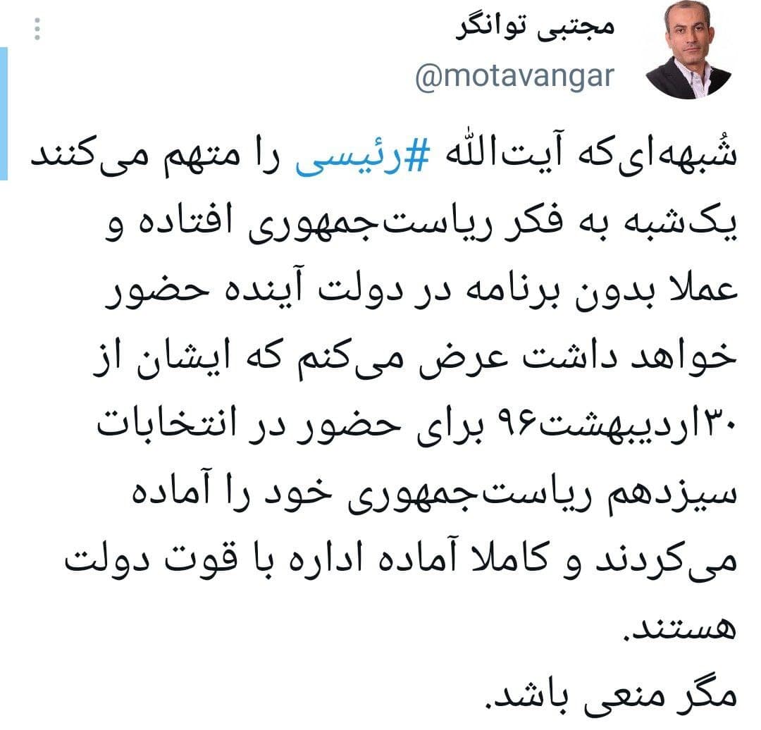 رئیسی از سال ۱۳۹۶ به دنبال کرسی ریاست جمهوری است/ آماده اداره دولت است، مگر منعی باشد