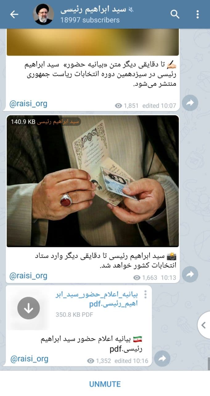همزمان با اعلام رسمی کاندیداتوری رئیسی برای انتخابات ریاست جمهوری، کانال او در تلگرام که از سال ۲۰۱۸ غیر فعال بود، دقایقی قبل اولین پست خود را منتشر کرد.