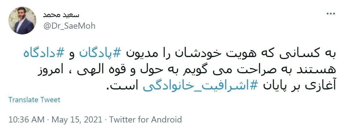 سعید محمد در پاسخ تلویحی به علی لاریجانی: امروز آغازی بر پایان اشرافیت خانوادگی است