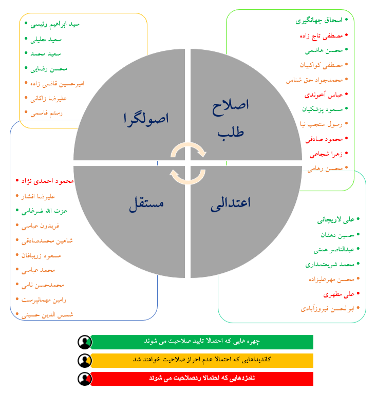 در هر یک از بخش های این چهار ضلعی، نام هایی که با رنگ سبز مشخص شده اند، به احتمال زیاد تایید صلاحیت خواهند شد، اما نام های قرمز ردصلاحیت شده و نام های نارنجی رنگ هم احتمالا با عدم احراز صلاحیت روبرو خواهند شد.