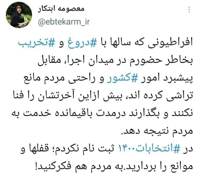 معصومه ابتکار در توییتی نوشت: افراطیونی که سالها با دروغ و تخریب به خاطر حضورم در میدان اجرا، مقابل پیشبرد امور کشور و راحتی مردم مانع تراشی کردهاند، بیش از این آخرتشان را فنا نکنند و بگذارند در مدت باقیمانده خدمت به مردم نتیجه دهد.