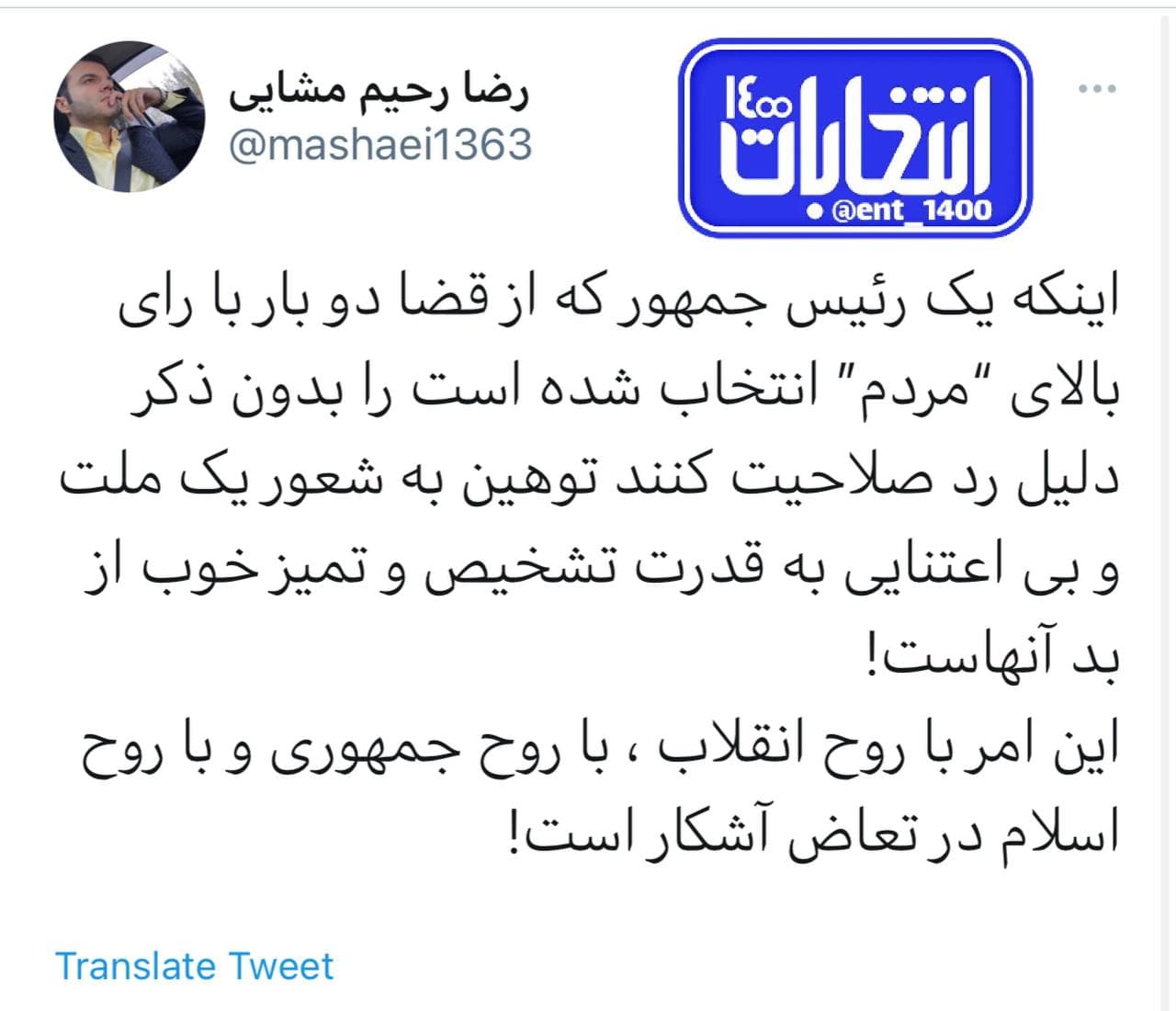 به لحاظ بعضی ملاحظات سیاسی میدان،رییس جمهور انتصابی خواهد بود و به همین دلیل علیرغم میل باطنی بنده رای نمیدهم