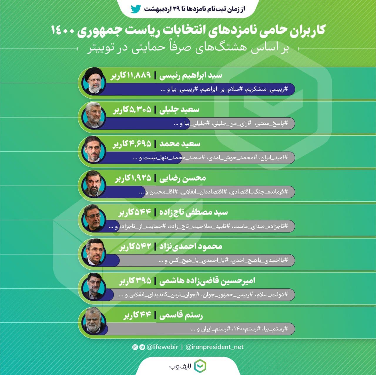 بررسی تعداد کاربران توییتر استفاده کننده از هشتگهای حمایتی در خصوص کاندیداها، از زمان ثبتنام تا ۲۸ اردیبهشت نشان میدهد که سید ابراهیم رییسی با ۱۲ هزار اکانت بیشترین حامی را در توییتر دارد.