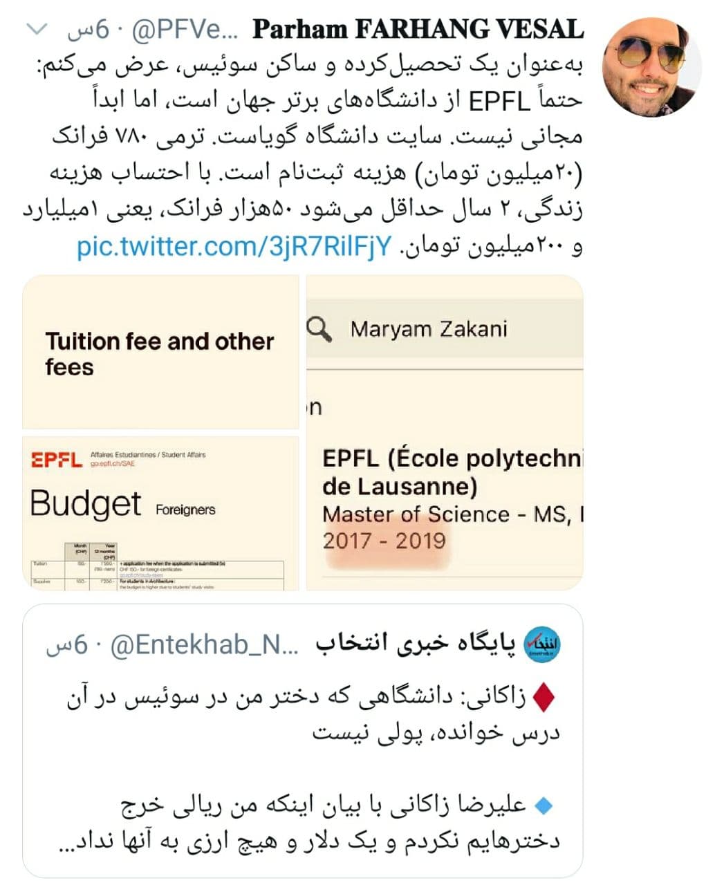 یک تحصیل کننده سوئیس در توییتی مدعی شد که دانشگاهی که دختر زاکانی در آن درس میخواند برای هر ترم 780 فرانک شهریه می گیرد.
