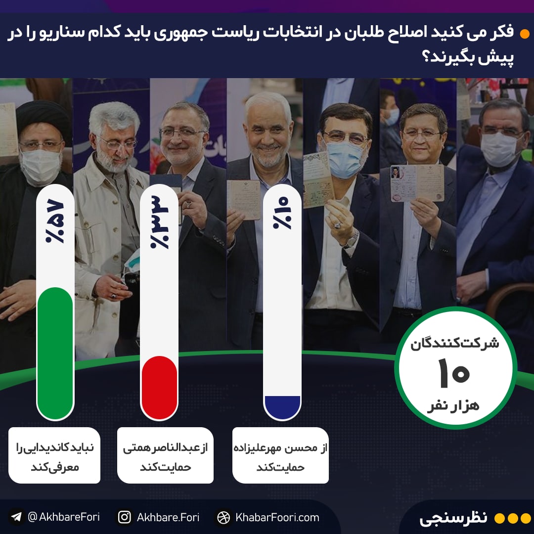 براساس نظرسنجی خبر فوری که بیش از ۱۰هزار نفر در آن شرکت کردند، از مخاطبان خواسته شد بین سه سناریوی پیشروی اصلاحطلبان، یکی را برگزینند.